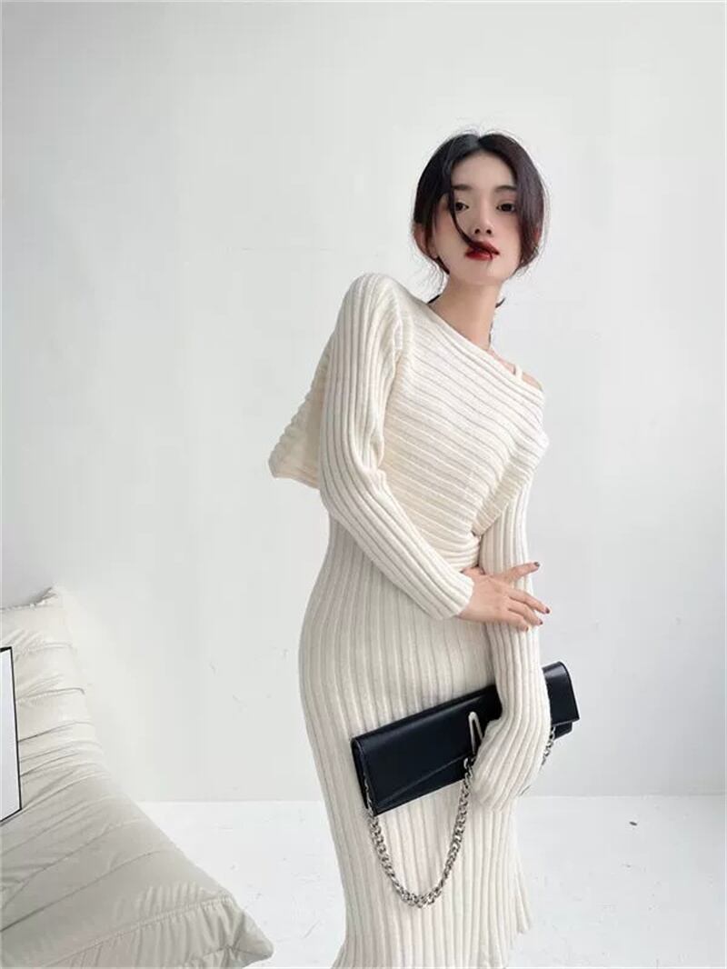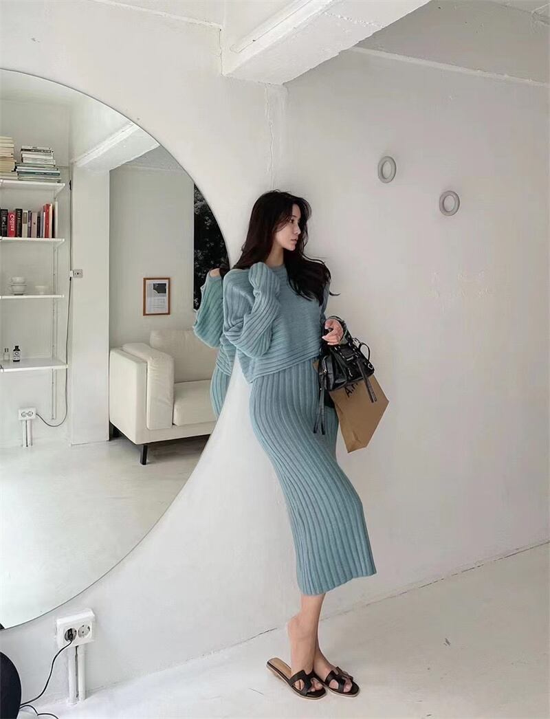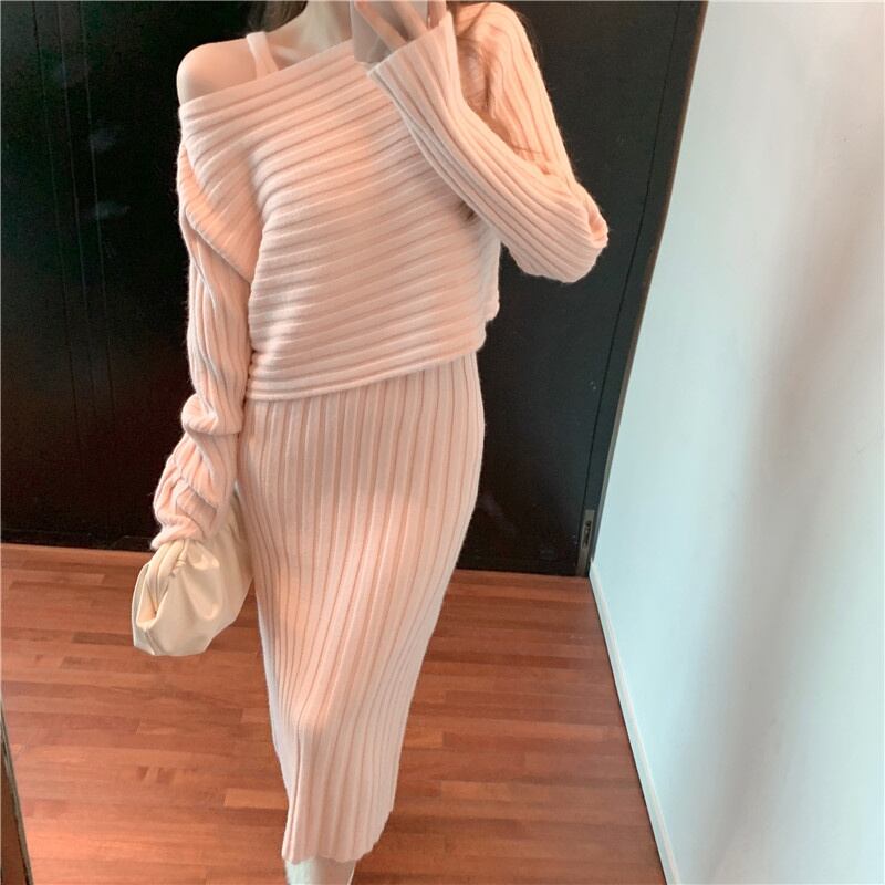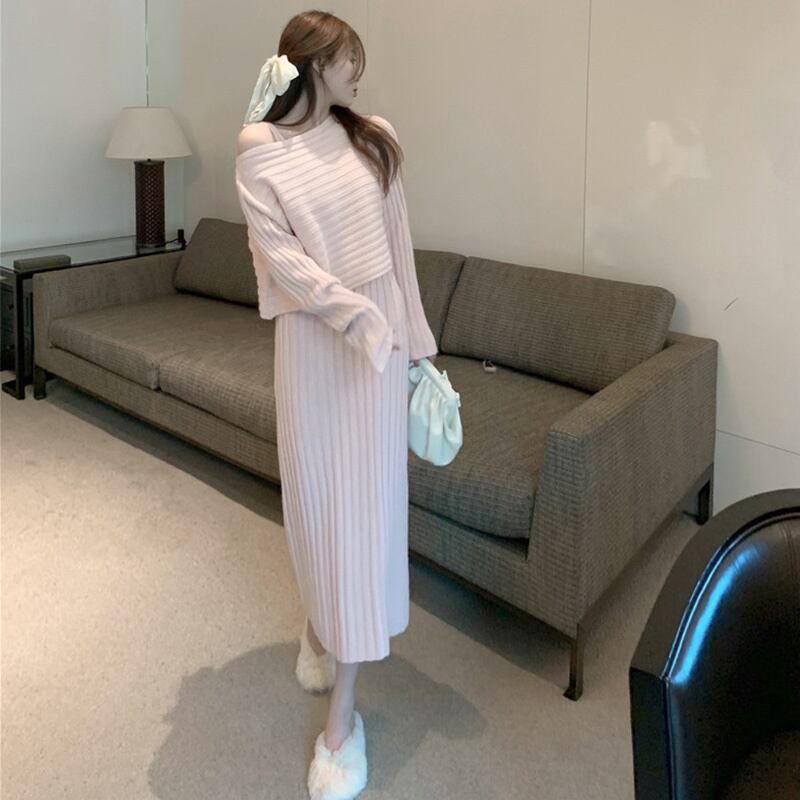 INS 秋新作 気質 シンプル ニット 長袖 セーター+キャミソールワンピース カジュアルセットアップ