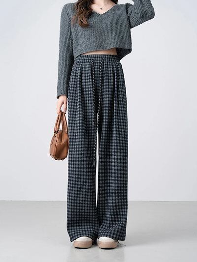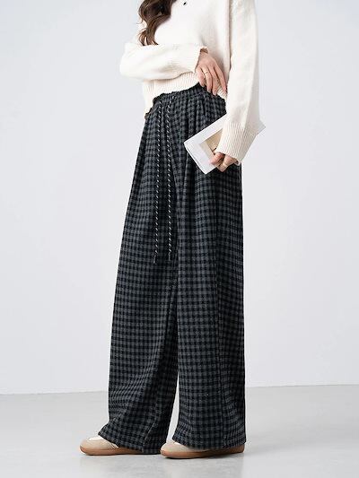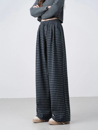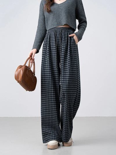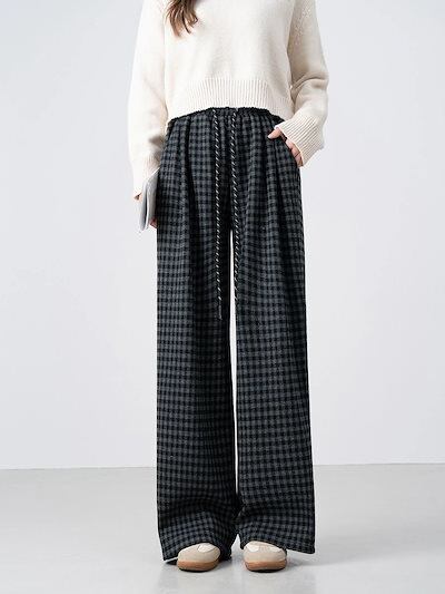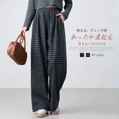 チェックパンツ レディース ワイドパンツ チェック柄 裏起毛 秋冬 ストレートパンツ ロングパンツ ズボン ワイド イージーパンツ ウエストゴム ボトムス リラックス あったか ゆったり おしゃれ 体