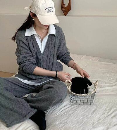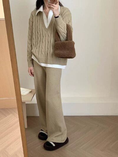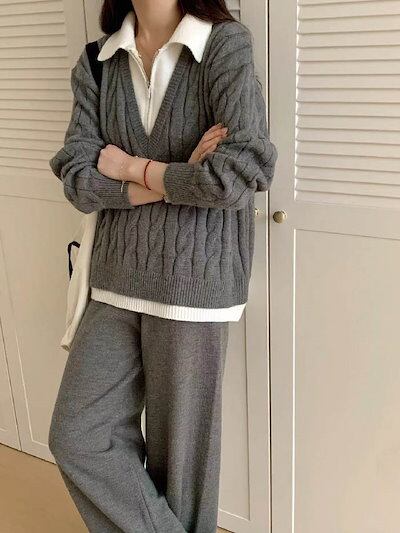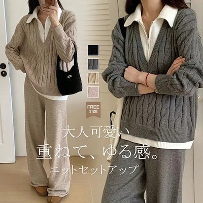 セットアップ レディース 秋 冬 ケーブル編み セーター 重ね着 ニット ワイドパンツ パンツスーツ 2点セット パンツ ロング丈 トップス 長袖 ケーブル編み レイヤード風 春 秋 冬 ゆったり 大