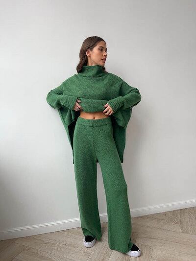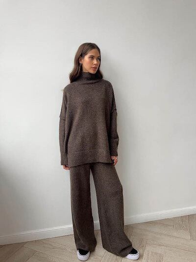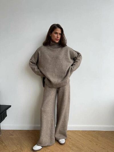 セットアップ レディース 春 秋 冬 ニット ワイドパンツ セーター 2点セット セーター ハイネック ゆったり パンツ ロング丈 ワイドパンツ トップス 長袖 ゆったり 大きいサイズ 体型カバー 着