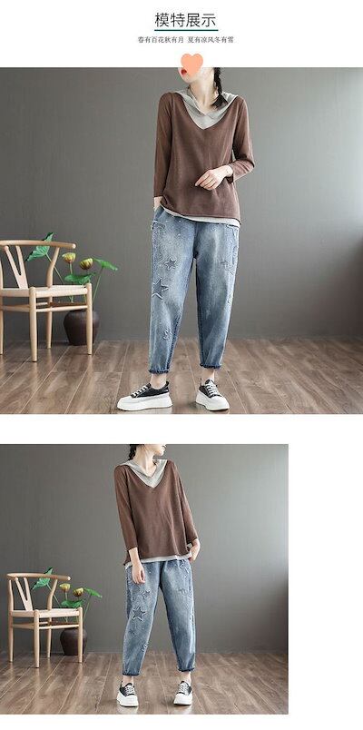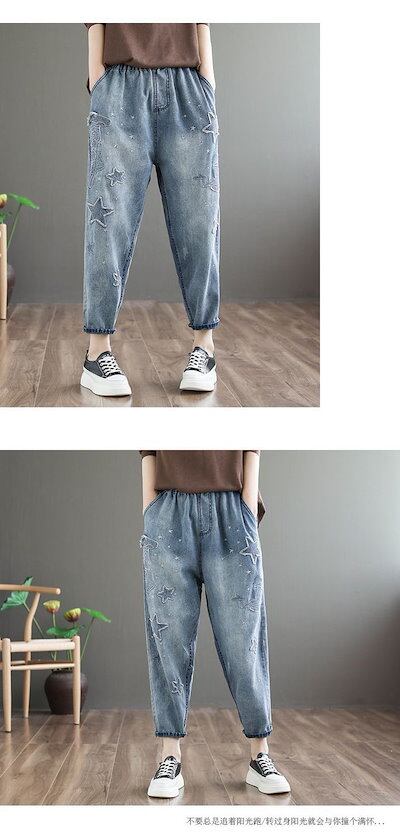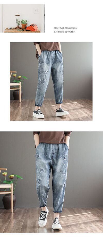 2025 年 春夏 新作 刺繍 デニム ハーレム パンツ レディース ゆったり ビッグサイズ 品質いいな新品 ストレッチ ウエスト レトロ ダメージ カジュアル セミロング パンツ