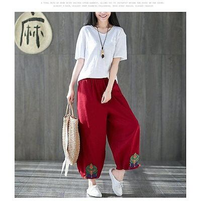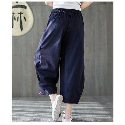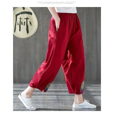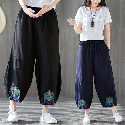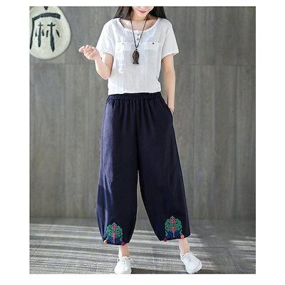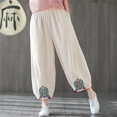 レディース 綿麻パンツ サルエル 九分丈 テーパード 刺繍 ポケット付き ゆったり 大きいサイズ