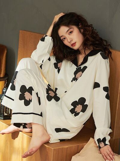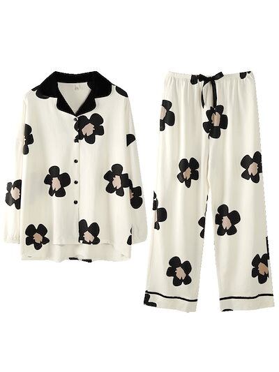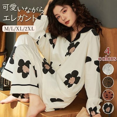 【メガ割り】レディース パジャマ 上下セット ルームウェア 春秋 秋冬 初夏 長袖 綿100%近い ゆったり 大きいサイズ かわいい お尻隠れ ホワイト 黒い大花 花柄 外出も ロングパンツ あったか