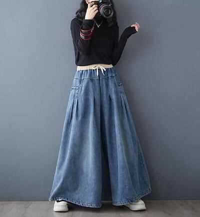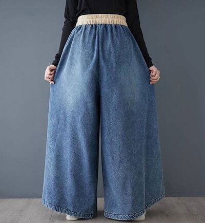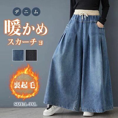 ジーンズ スカーチョ 裏起毛 ロングパンツ ワイドパンツ デニム デニムパンツ デニムスカーチョ レディース きれいめ 大きいサイズ ゆったりシルエット 冬用あたたかパンツ 股上深め