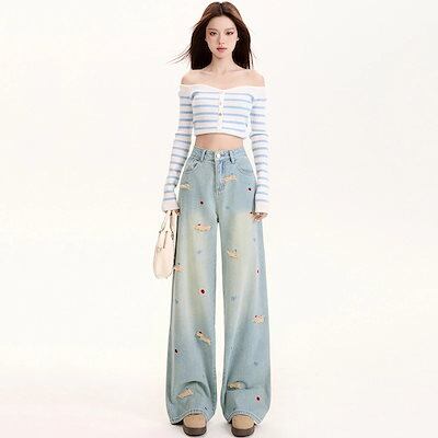 デニムかっこいいスラックスパンツシンプルカジュアル 25 ダックスフント ワイドパンツ デニムパンツ 刺繍 ハイウエストゆったり見えやせ パンツ レディース