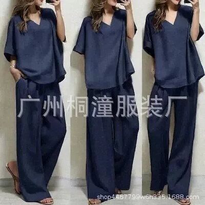 大人 オシャレ 2点セット ハーフ袖トップス ウエストのタイとサイドポケット付きワイドパンツ + Vネック ゆったり レディース セットアップ