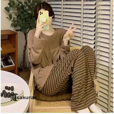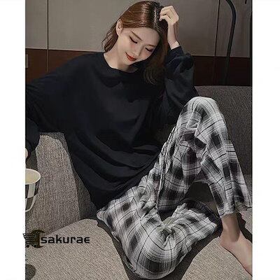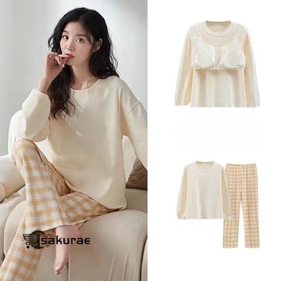 [初回販売促進]ウェア 上下セット パジャマ カップ付き ネグリジェ レディース ゴムウェスト 長袖 部屋着 寝間着 ゆったり カジュアル 可愛い チェック柄 ロングパンツ【人気商品超目玉】