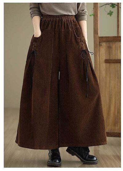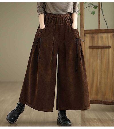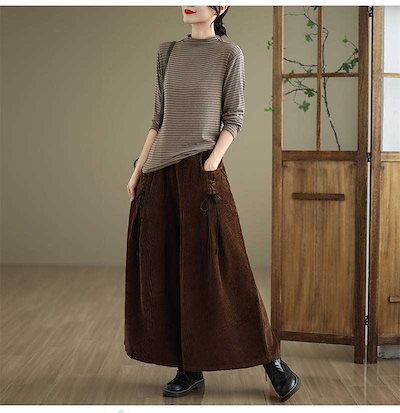 コーデュロイ ワイドパンツ レディース 無地 パンツ ガウチョパンツ ボトムス コーデュロイパンツ ロング 9分丈 紐 ポケット デザイン感 ゆったり 秋 冬 カジュアル 体型カバー レトロ 通勤 O