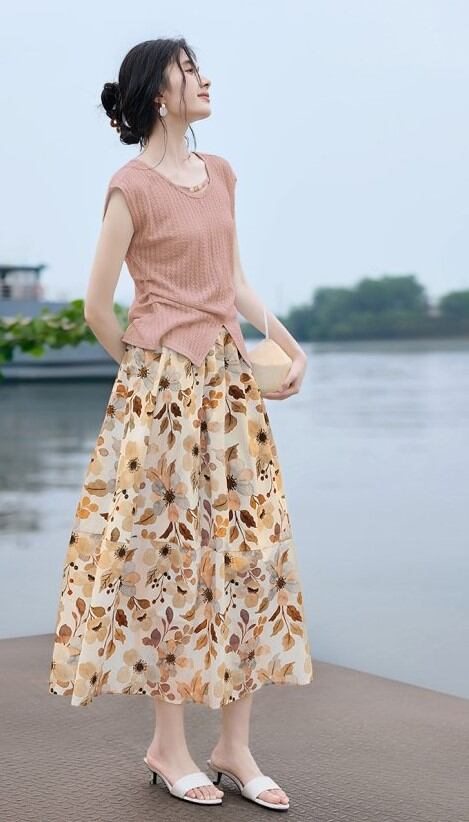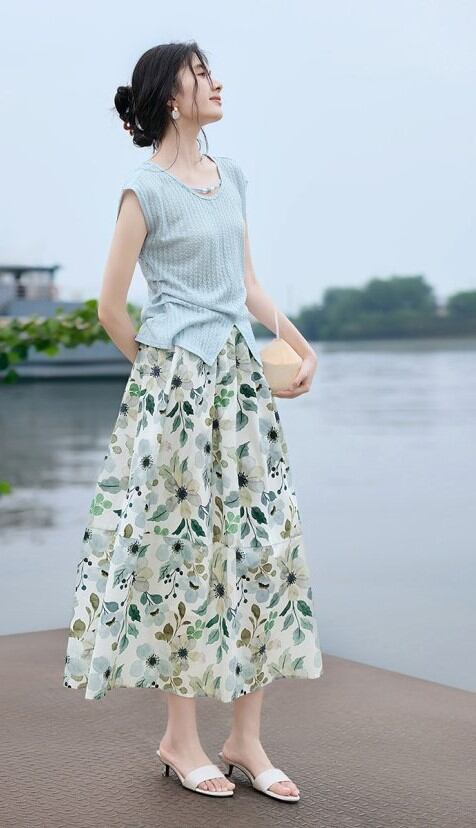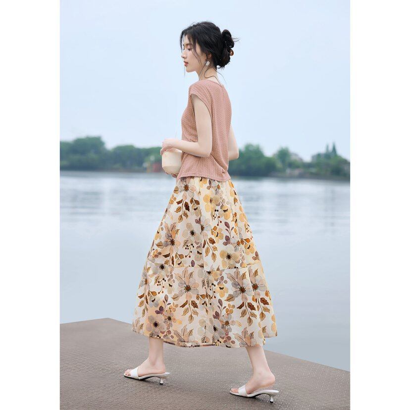 初回送料無料 夏作ノースリーブニットプリント半身スカート 2点セット レディースファッション人気