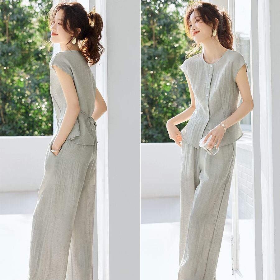 初回送料無料 夏作丸首袖なしシャツ上着 長ズボン 2点セット レディースファッション人気