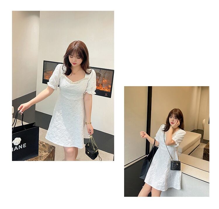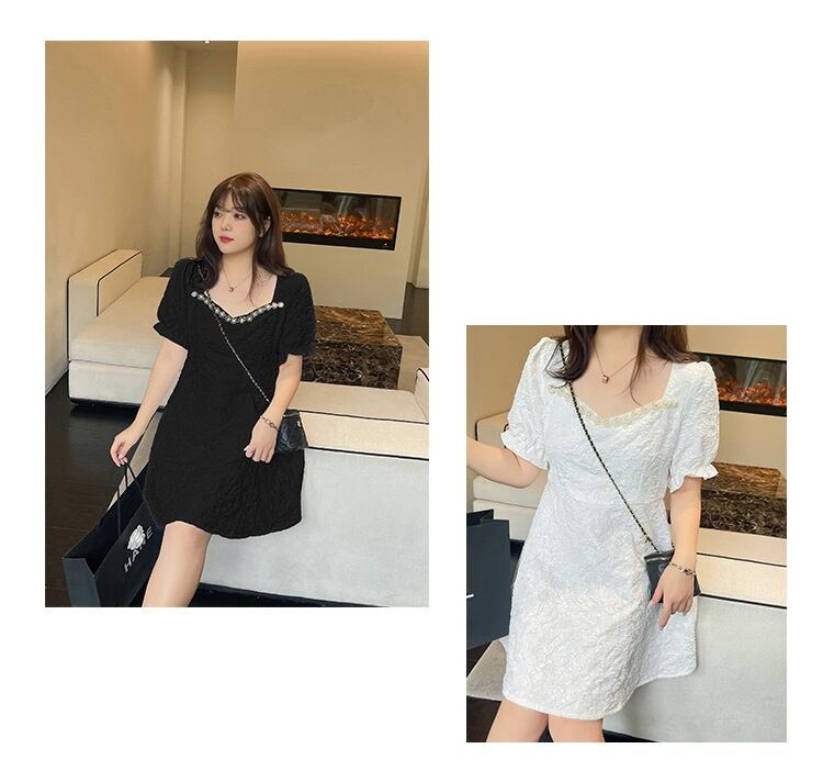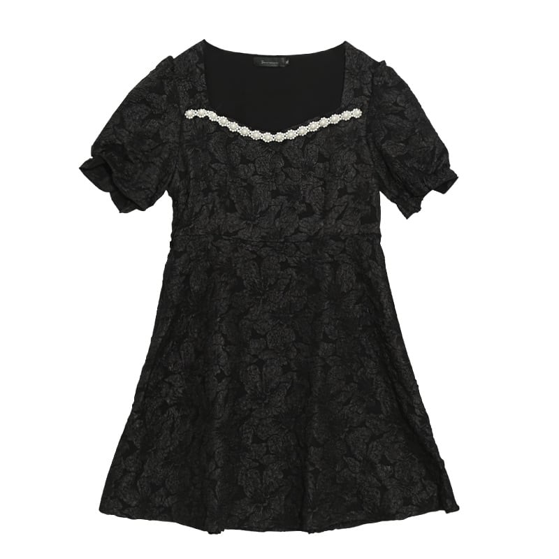 ★2L〜6L 大きいサイズ★胸元パール付き 上品感ジャガード織パフスリーブドレスワンピース