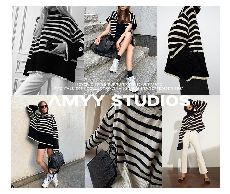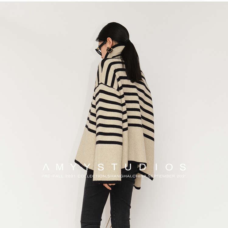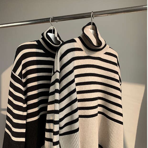 ハイネックニット ニットセーター 厚手 ストライプ柄 体型カバー 着回し レディース