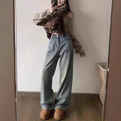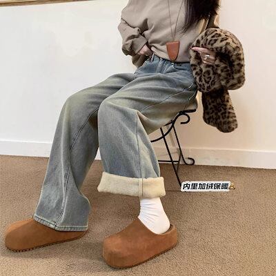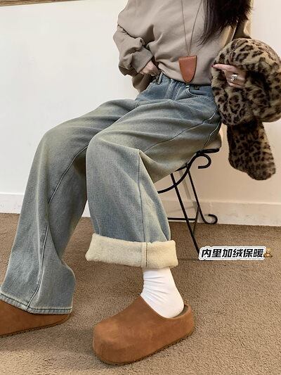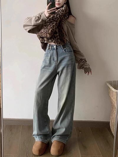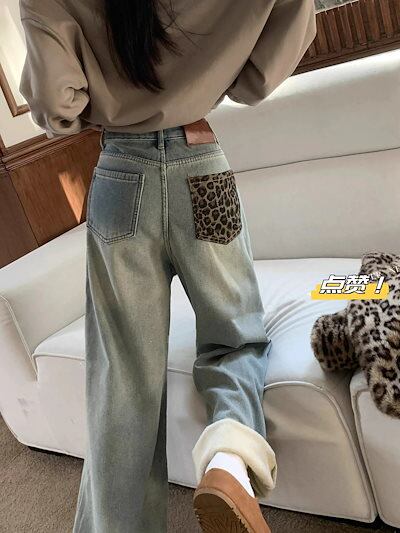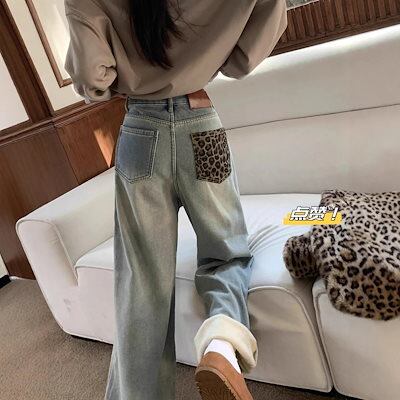 ワイドパンツ レディース 2025 冬新作 レディース 裏起毛レオパードポケットデニム ヴィンテージラフスタイル 万能マッチ スリム効果 ナローワイドレッグ 裏起毛パンツ ワイドパンツ 裏