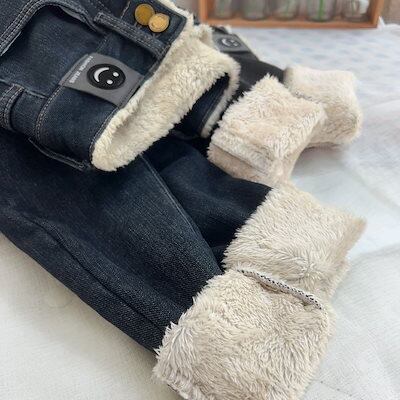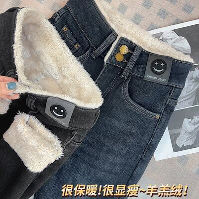 2025 冬新作 レディース 超厚裏起毛ウールデニムハイウエスト保温スリムフィット ブーツカットパンツ アウター着用 裏起毛パンツ