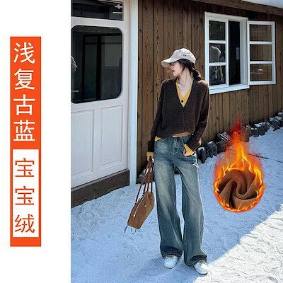 ワイドパンツ 2025 冬新作 レディース カーキベースベビーフリース保温水洗デニムハイウエストワイドレッグ スリム効果 ワイドパンツ 裏起毛 パンツ ワイドパンツ レディース