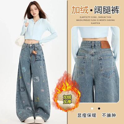 ワイドパンツ 裏起毛 2025 秋冬新作 レディース アメリカンヴィンテージ刺繍キティちゃんデニムハイウエストルーズスリム 裏起毛 ドラッグパンツ 裏起毛パンツ ワイドパンツ レディース