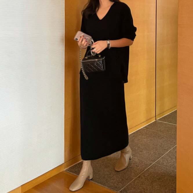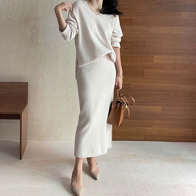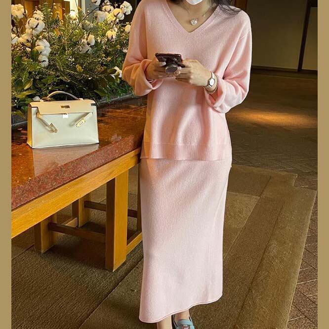 【秋新作】韓国風レディース服 シンプル カジュアル きれいめ vネック ニット セットアップ