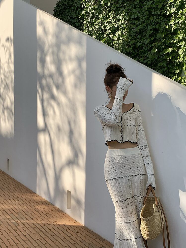 楽ちんなのにドキッとさせる 透かし彫り ニットトップス 上着 セットアップ ロングスカート スリム