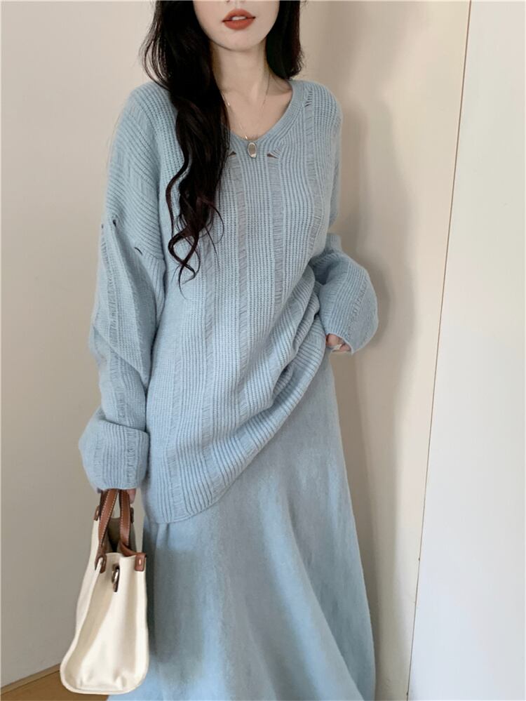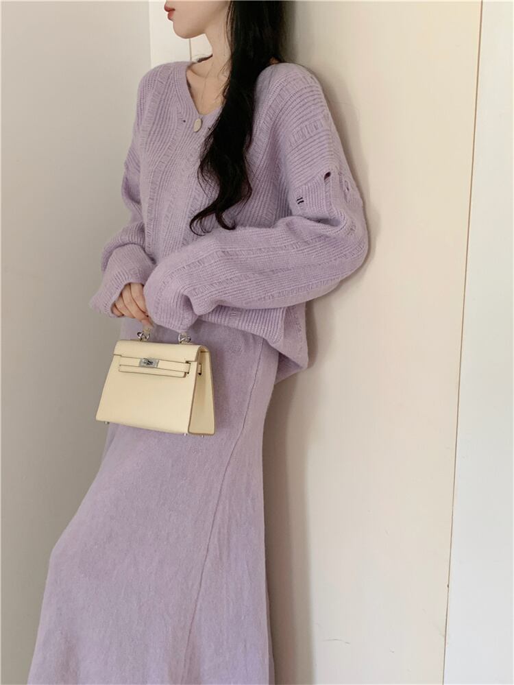 カラバリ豊富 透かし彫り ロングスカート スリム 大人気 セーター ニットトップス セットアップ