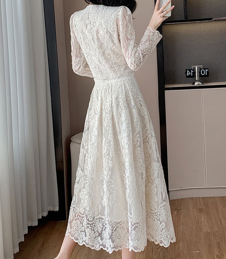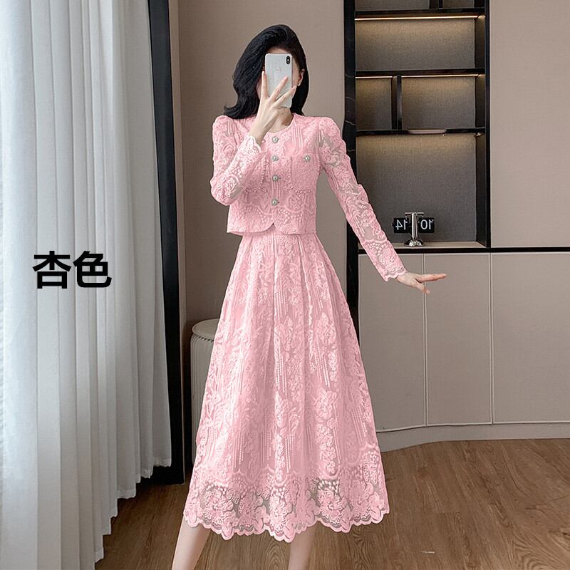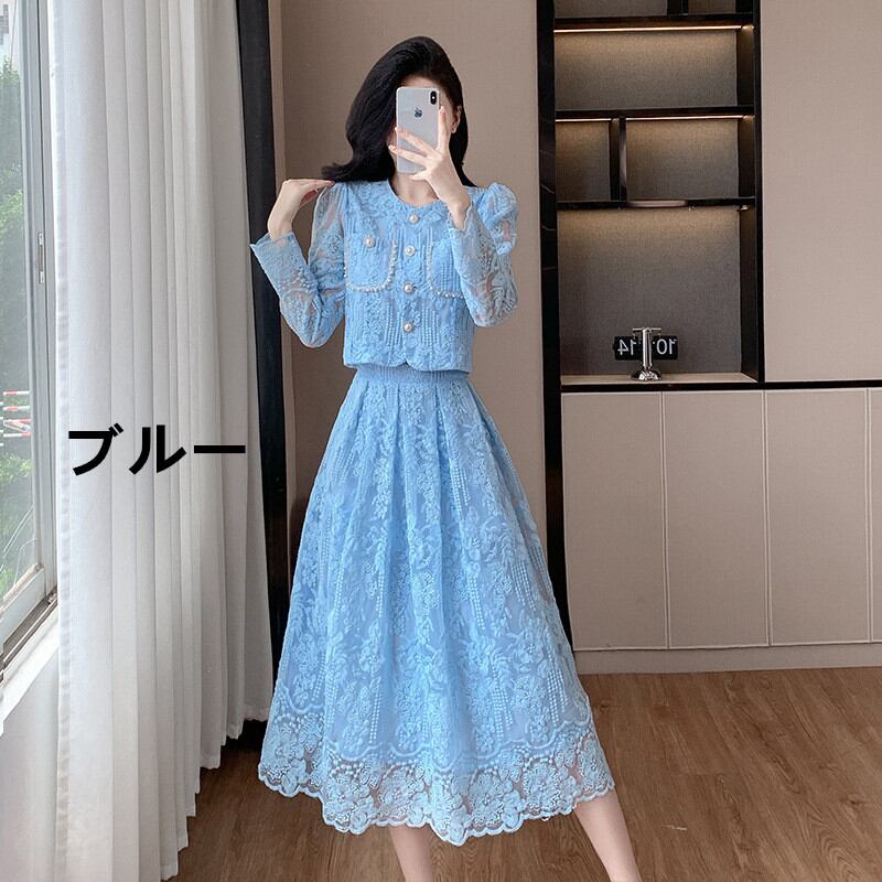 セットアップ アウター 長袖 フレアスカート 花柄刺繍 ロングスカート 体型カバー レースドレス 上下セット