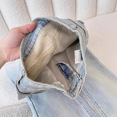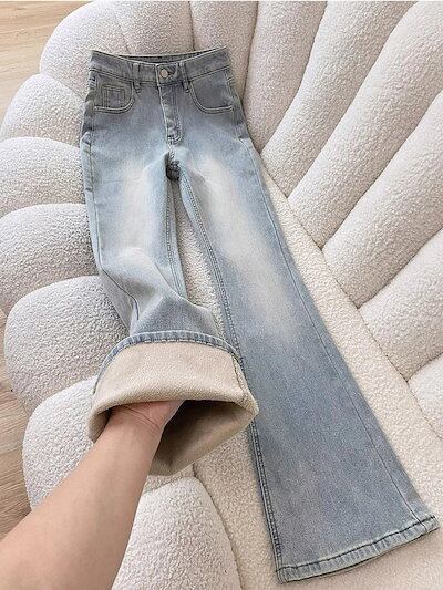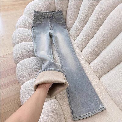 ライトカラーのフリース裏地厚手わずかにフレアなレディースジーンズ2025年冬の新作スタイルハイウエストスリミングヒップカバー伸縮性のある馬蹄形パンツ