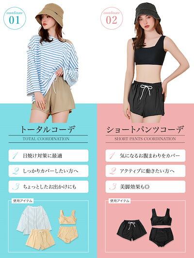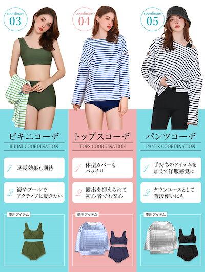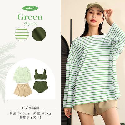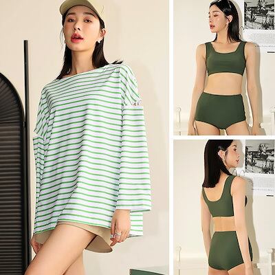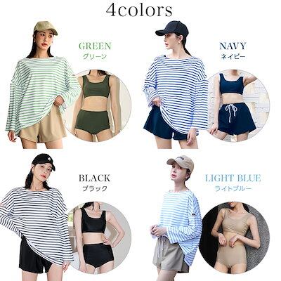 OSYAREVO【国内発送】 水着 レディース 体系カバー 冬秋春夏 水着 レディース ビキニ セット水着 4点セット 体型カバー ボーダー柄 ラッシュガード 長袖 ショートパンツ 可愛い アームカット 無地 タンキ