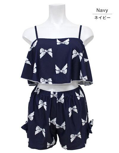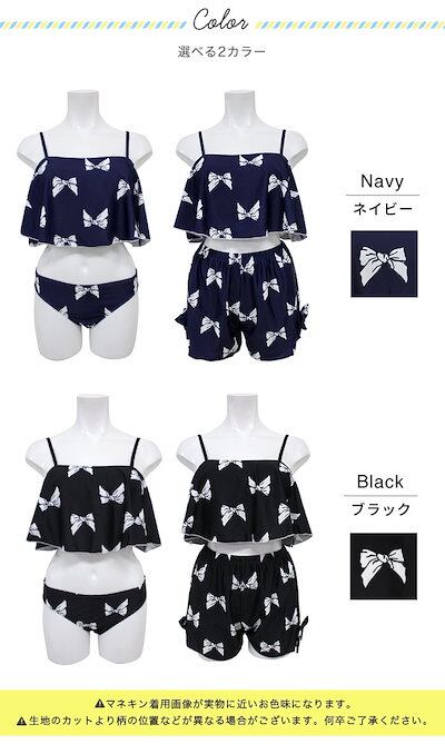 【国内発送】 水着 レディース 体系カバー 冬秋春夏 水着 体型カバー バンドゥビキニ フレア リボン柄 フレアトップ バンドゥ 小胸 ショートパンツ レ