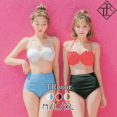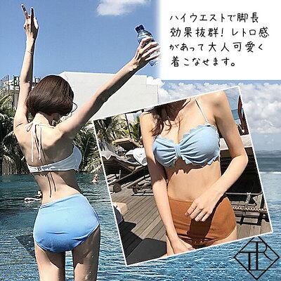 【即納】水着 レディース 水着 体型カバー ビキニ 大きいサイズ ビキニ 人気 盛れる バンドゥビキニ バイカラー ハイウエスト カジュアル シンプル フェミニン ガーリー キュート セクシー 大人可