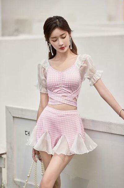 【即納】水着 レディース 水着 体型カバー キュート セクシー パフスリーブ クロス ビキニ チェック柄 人気 M L XLトレンド セパレート カラフル フェミニン 大人っぽ 女子 リゾート