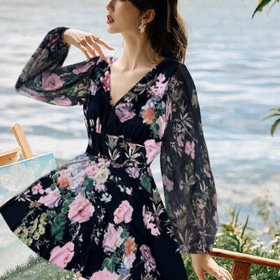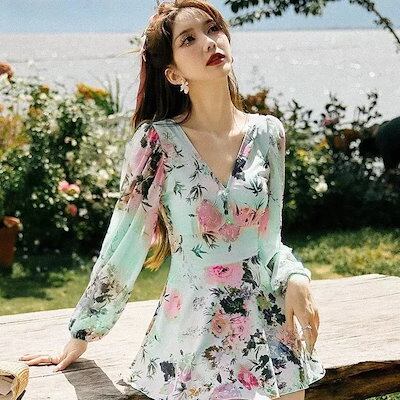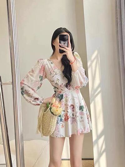 【3日出荷】花柄保守ファッション水着体型カバーオールインワン大きいサイズ長袖 レディーススウィート温泉スイミングウェア韓国ファッションお腹カバー太ももカバー