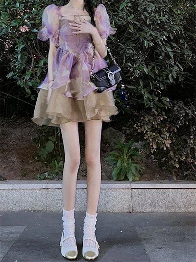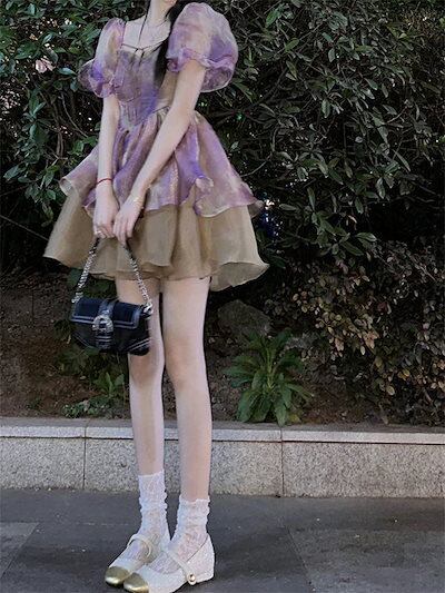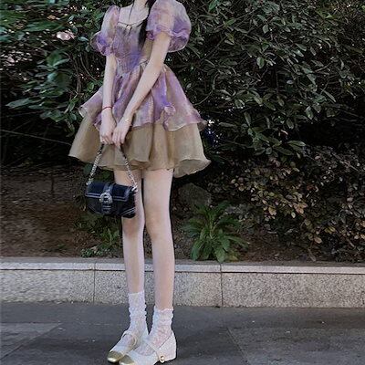 ロリータドレス 2025 春夏 新作 ティーブレイクドレス バブル袖 ワンピース ポンポンスカート