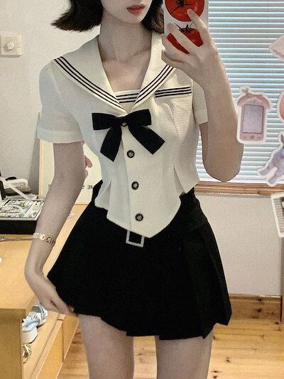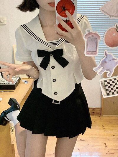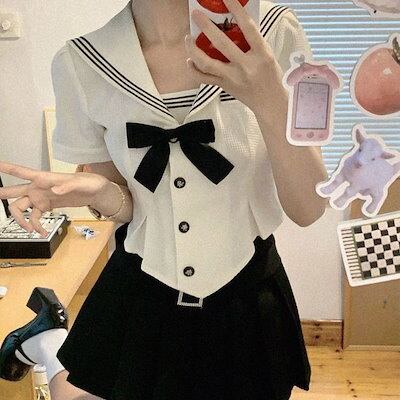 脚魅せミニスカキャンパス風 JK 制服 三点セット人气新作 韓国ファッション 海軍領 セーラー服 シャツ+スカート