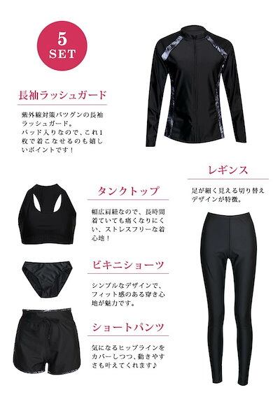 体型カバー 水着 レディース 長袖ラッシュガードセット 5点上下セット UVカット フィットネス水着 セパレート かわいい タンキニ ショートパンツ レギンス付き ママ水着 30代 40代 5 20代