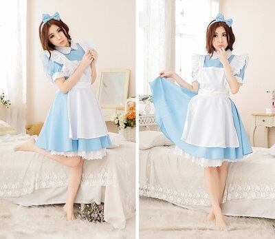 ファーウェイ アリス*青い軽音ロリータメイドコスプレ侍女装メイド(服+黒いリボンの頭飾り)