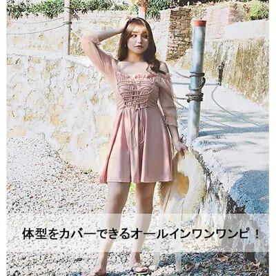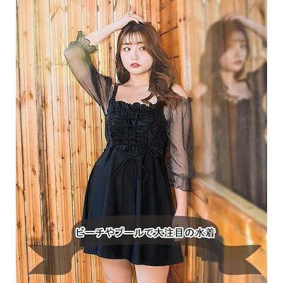 3L〜5L対応レディース 水着 ワンピース ぽっちゃり 体型カバー 韓国風 オトナ女子 袖あり フリル レースアップ 大きいサイズ ビーチ プール 海 透け感 日焼け防止 UVカット 可愛い 大人