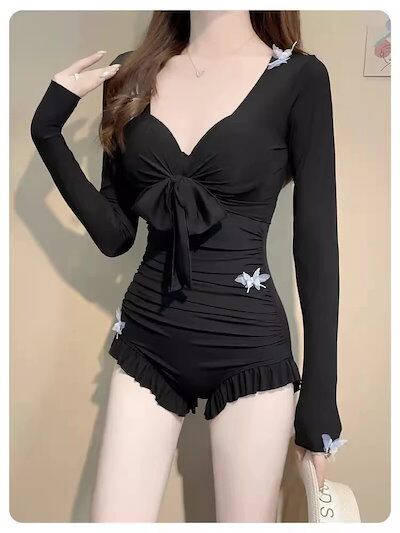 【3日出荷】ワンピース水着 高級感 体型カバー スリム 長袖 UV カット ワイヤー入り 温泉ビーチ用レディース水着