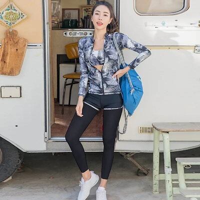 スポーツウェア ウェットスーツ 体型カバー 長袖 カバーアップ 水陸両用 水着 サーフィン五点セット 長袖ラッシュガード フィットネスウェア 福袋 レディース 女性用 上下セット UVカット T