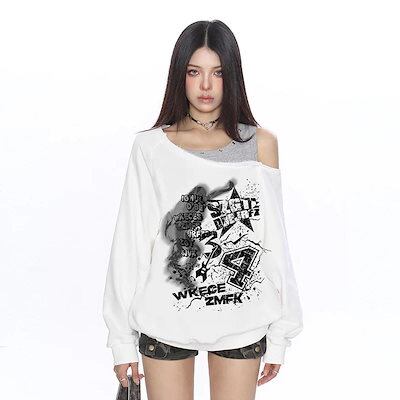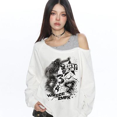 スウェット アメリカンスタイル オフショルダー スウェットシャツ 女性用 秋用 ゆったり 斜め肩 トップス