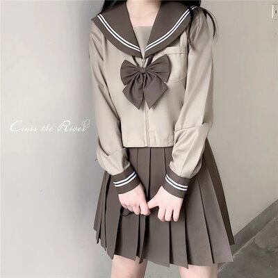 セーラー服 なんちゃって制服 セット セーラー襟 女子高生 制服 韓国制服 コーヒー色 上下セット 長袖 リボン 春 花見 入学式 卒業式 ブラウス スカート スーツ プリーツスカート レディース フ