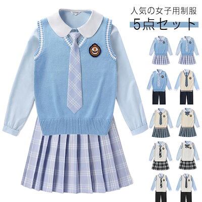 女子 制服 5点セット 女子高生 学生制服 ニットベスト 長袖シャツ JK制服 上下セット 発表会 コスプレ衣装 チェックスカート リボン スクール 通学 学生服 卒業式 入学式 スーツ 女子 仮装