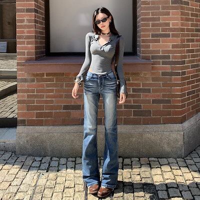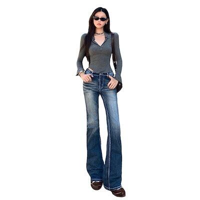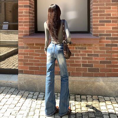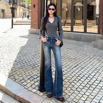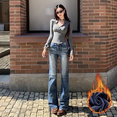 裏起毛パンツ 裏起毛 アメリカンレトロ ウォッシュ加工 毛羽立ち スリムフィット ストレッチ ストレートジーンズ 女性用 ローウエスト セクシー ロングパンツ
