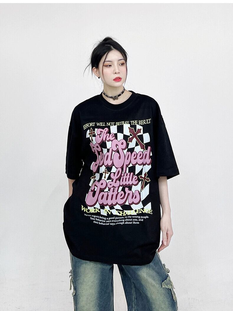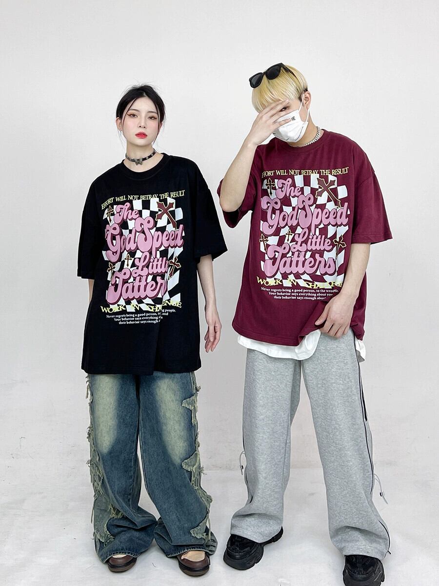 BOROI2024 アメリカンクリエイティブレターチェック柄プリント夏半袖 Tシャツ男性と女性のレトロな大きいサイズルーズヒップホップ 大きめサイズ サマー 夏物 トップス シャツ chihi0211a69513252000