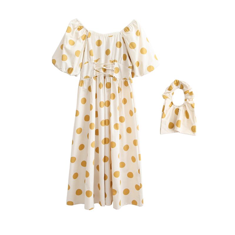 バック付き半袖ワンピースフラットネック水玉ロングワンピース FBB62559