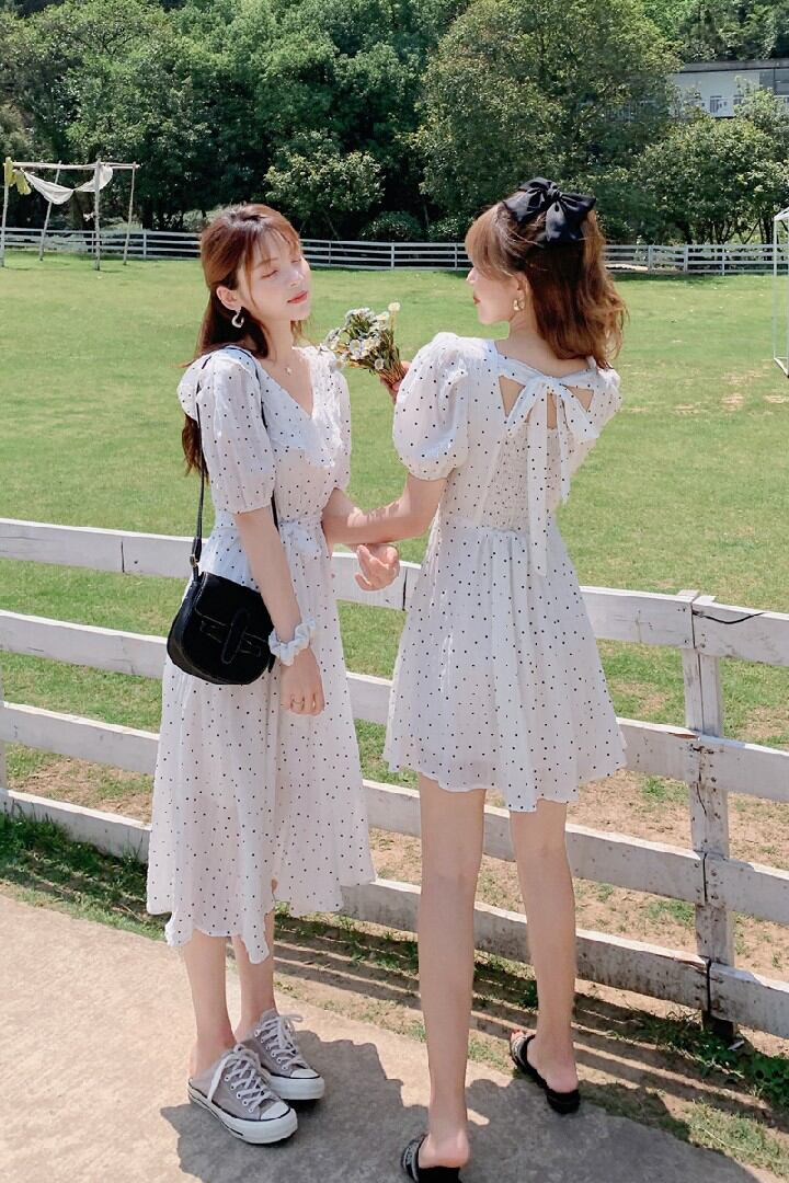 ウエスト半袖ワンピースパフスリーブVネック水玉ショート FGN2369