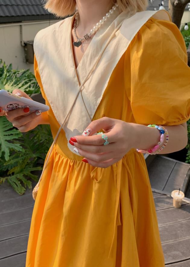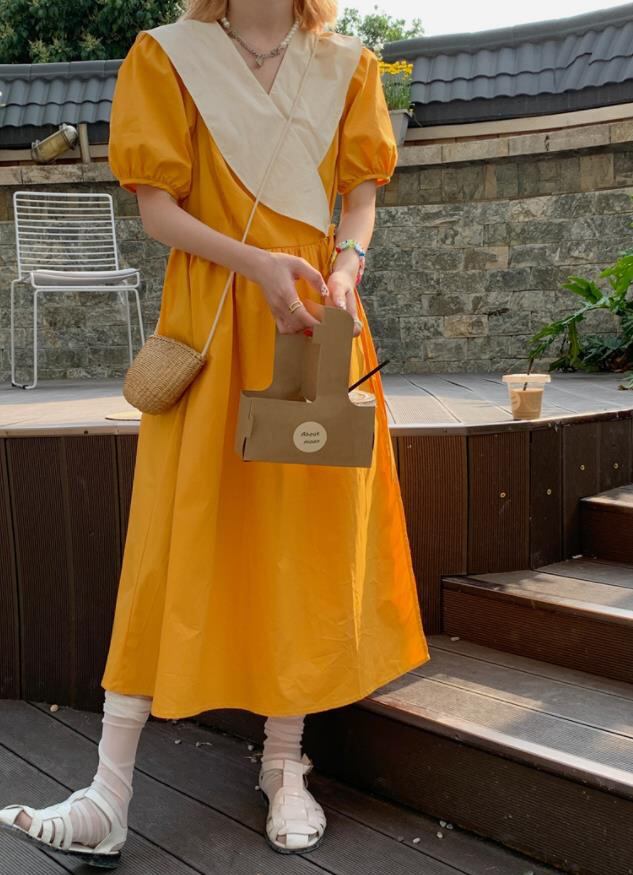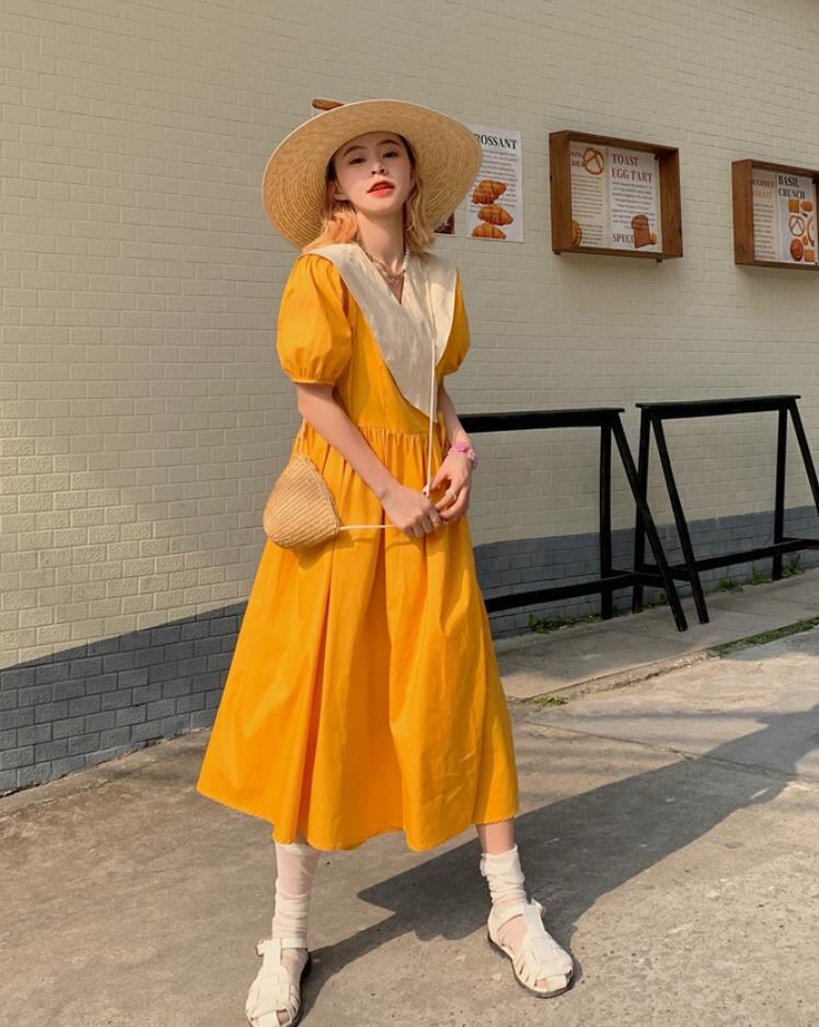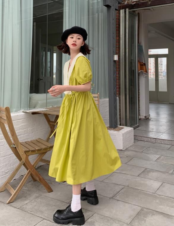 春夏新作 女 レディース ハイウエスト 半袖 パフスリーブ ロング ワンピース 台型スカート 2色EERMJNB3697005