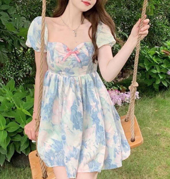 春夏新作 女 レディース ハイウエスト 半袖 パフスリーブ ミニ ワンピース ドレス 台型スカート S-2XLYUIKJMP26398028