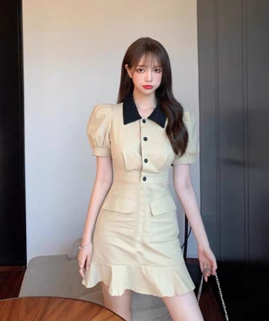 春夏新作 女 レディース ハイウエスト 半袖 パフスリーブ ミニ ワンピース ドレス マーメイドスカートGYTRMZ3698510112