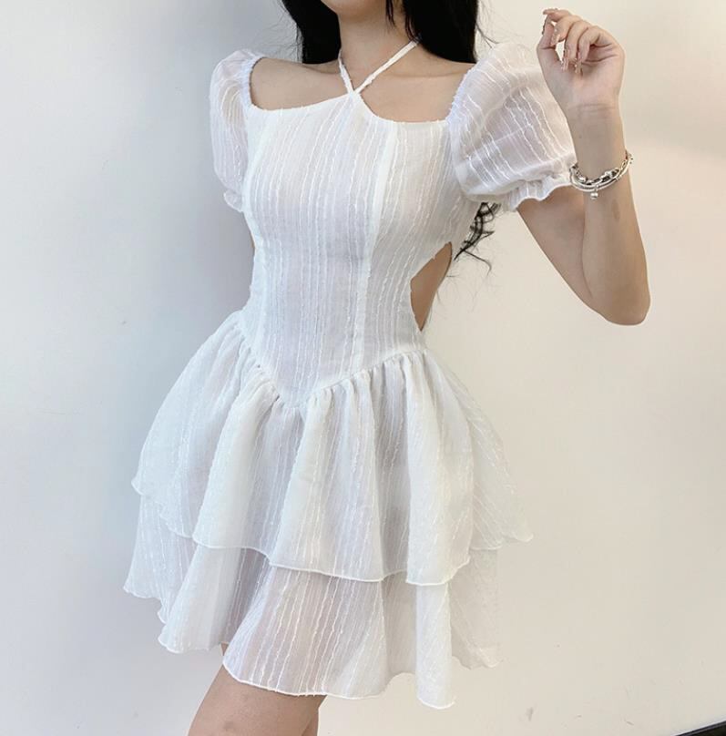 夏新作 女 レディース ハイウエスト 半袖 パフスリーブ ミニ ワンピース ドレス 台型スカート S-LMKUIHT25126132