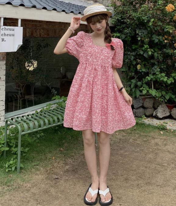 春夏新作 女 レディース ハイウエスト 半袖 花柄 パフスリーブ ミニ ワンピース ドレス 台型スカートMKUIHT25126140