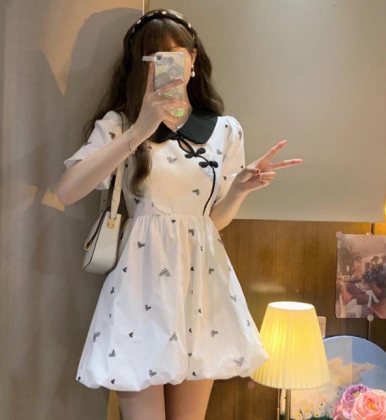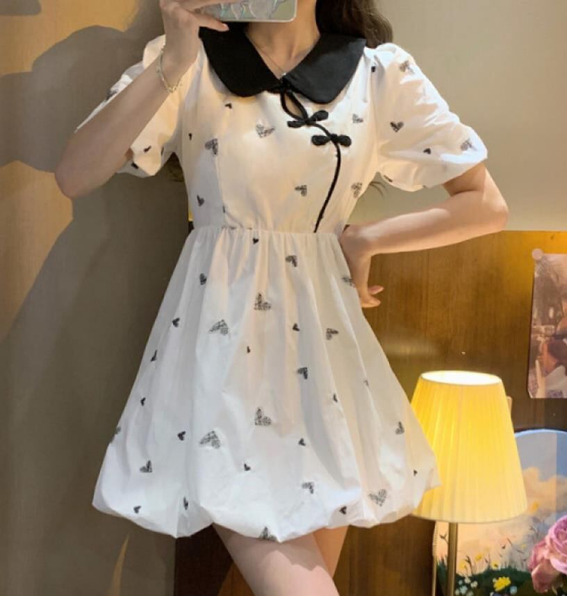春夏新作 女 レディース ハイウエスト 半袖 デニム パフスリーブ ミニ ワンピース ドレス 台型スカート GVBO2369